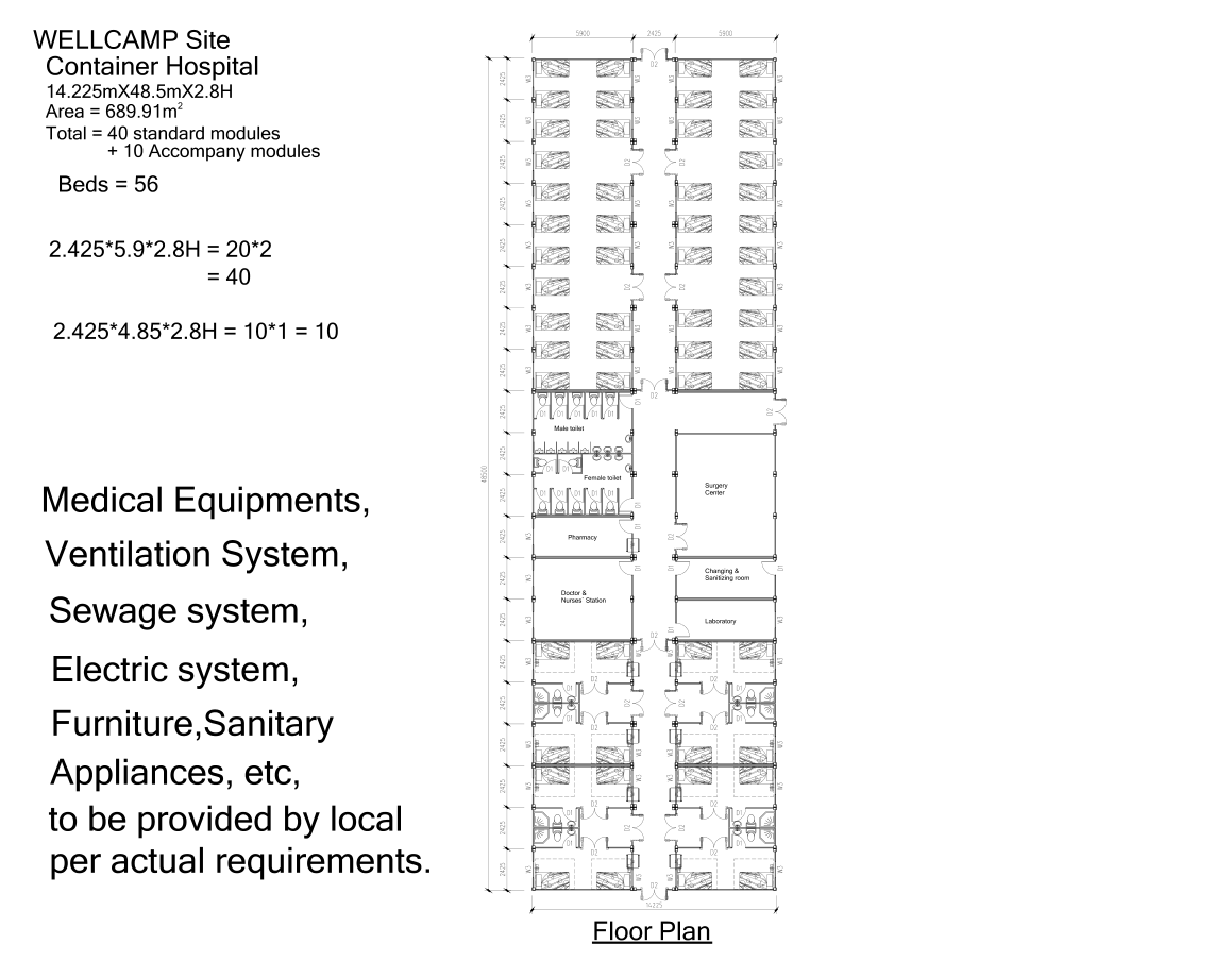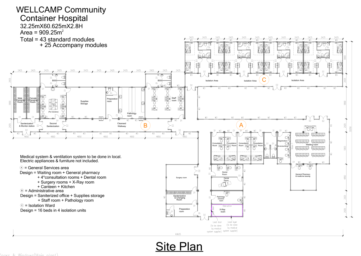 استخدمت شركة SOEASY تصميم مستشفى الحاويات الخاص بنا الذي يتسع لـ 50 سريراً. وبأبعاد 14.2 متر × 48.5 متر، يتناسب التصميم الخطي تماماً مع المواقع ذات المساحة المحدودة.